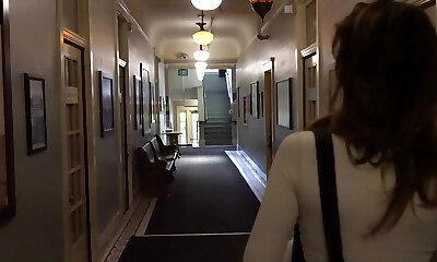 Juicy cis MILF got banged in the elevator by two horny ladyboys
